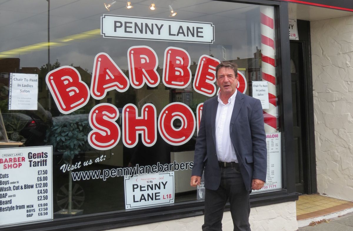 | Leslie Cavendish outside a barbershop in Penny Lane, Liverpool. |